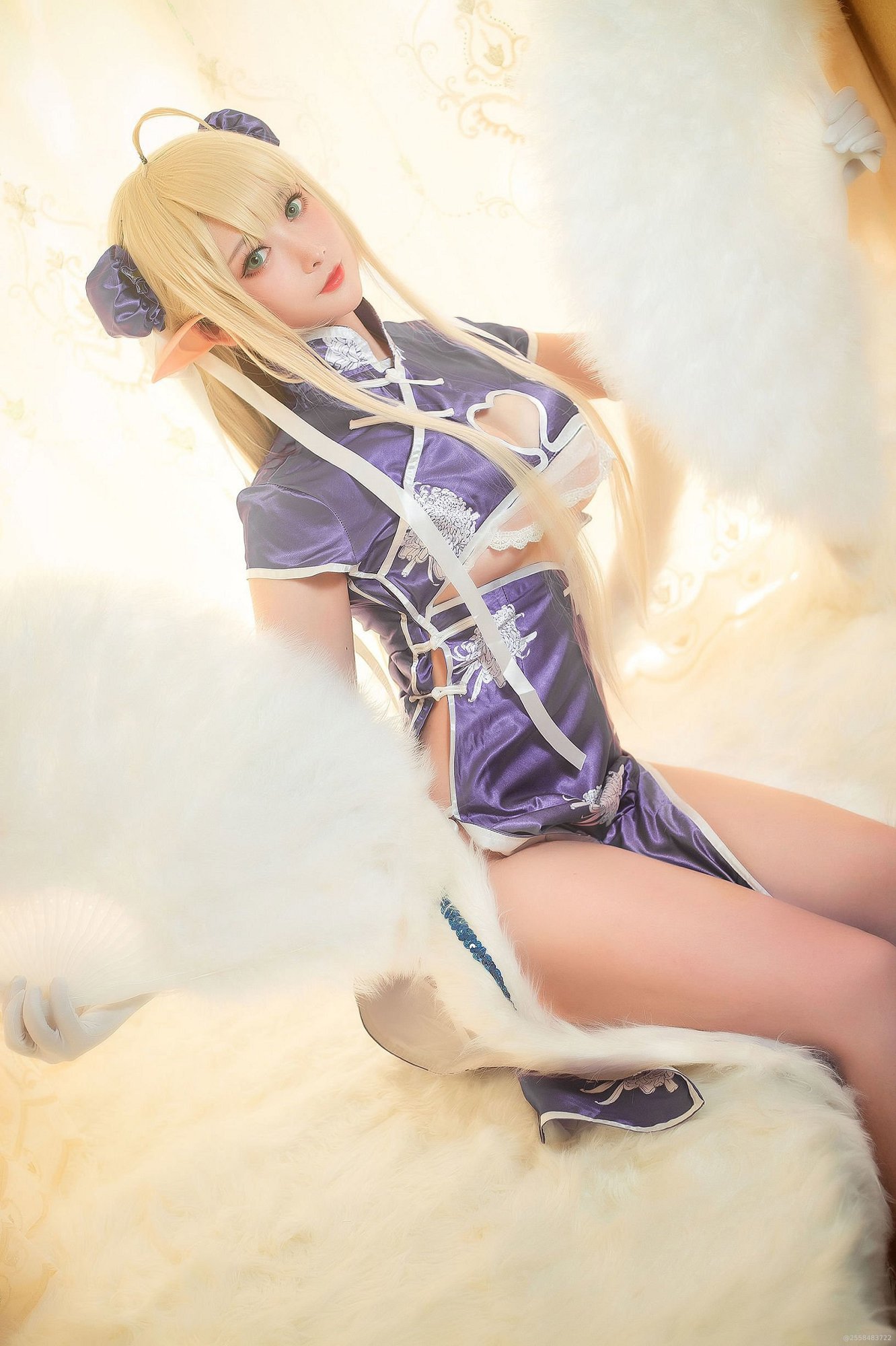 然后咱们来聊聊她的服装和造型。这期里面有好几套Look,但核心风格都围绕着“清新”和“甜”。比如有一套是简单的白色吊带搭配牛仔短裤,非常日常,但你仔细看,配饰上花了心思,一个小发卡,一根细细的项链,瞬间就有了日系二次元少女写真的那种精致感。还有一套是有点古风元素的睡衣?或者说是改良的汉元素服饰,淡蓝色,上面印着小小的花纹。这个搭配就很有意思了,它把古风cos的唯美和居家写真的私密感结合了起来。她躺在那,眼神有点迷离,又不经意地看着镜头,氛围感直接拉满。我当时看的时候就在想,这要是换成那种特别夸张、层层叠叠的古装,在这个居家环境里反而会显得笨重和不协调。她现在这样,轻盈、柔美,把那种“清水出芙蓉,天然去雕饰”的感觉拍出来了。这其实也是很多coser套图容易忽略的地方,服化道不是越华丽越好,适合场景、能突出人物气质才是王道。